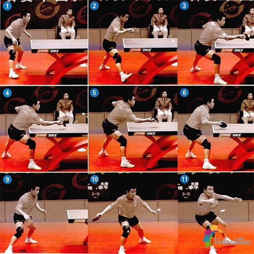 組圖選自第一次直通薩格勒布大循環馬琳對張超競賽的場景。圖1-5馬琳發下旋球到張超中路偏反手位,從圖5中馬琳右腿張緊的肌肉來看,他還原后準備側身。但對方出其不意地把球劈到了馬琳的正手位大角度。圖6-10馬琳實時調整重心,交織步上步拉球。