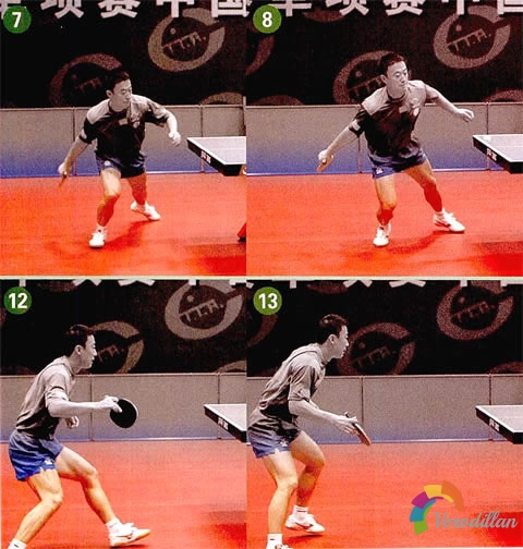 圖11-13中我們看到馬琳左腳快速回撤,右腳跟進的還原動作。雖然失去了反手位,但重心迅速回到身體中軸線使馬琳仍能夠保證下板擊球。