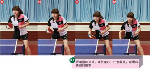 本篇樹模隊員的特點是手感好,線路和落點的意識強,且反手手藝相對突出。因此反手發球后銜接搶位是她主要的得分手段。反手發側上、下旋球時要注重以肘動員前臂,手腕發力摩擦要突然,同時身體向前壓。發球后,身體要迅速還原,當對方回球到自己的反手位時,要注重收腹,降低重心;同時右肩下沉,肘樞紐略向前頂出。觸球時,身體向前上方發力,前臂以肘樞紐為軸,快速揮舞并帶著手腕手指舉行發力。若是拉直線,手腕內收的幅度要更大,同時要行使身體重心輔助擊球。