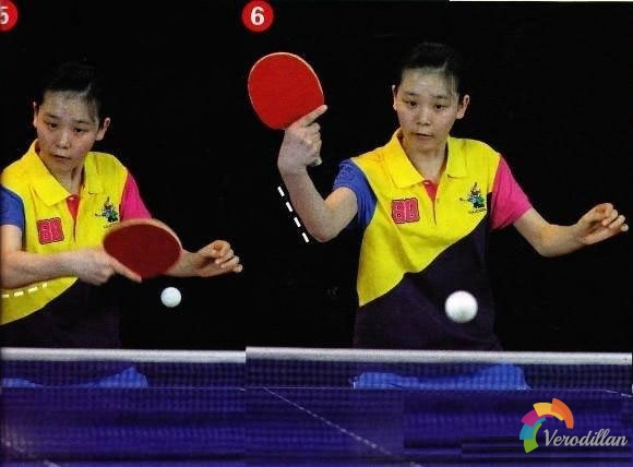 圖5-6:來球在本方臺面彈起時,以雙腿蹬地轉腰,小臂迅速向前上方揮拍,在下降前期摩擦球的中上部,以向上的氣力為主。