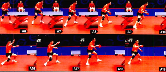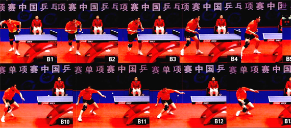 組圖A中,王皓正手發(fā)側(cè)下旋“鉤子球”(圖1-5),這種發(fā)球在觸球時,由于拍形內(nèi)收(圖4),使對方不容易判斷發(fā)球的旋轉(zhuǎn)。王皓發(fā)球后稍稍后撤,準(zhǔn)備正反手兩面上手(圖8-9)。當(dāng)他發(fā)現(xiàn)對方劈長到自己反手大角后,由于來球速度較慢,王皓決定側(cè)身進攻。他首先壓低身體中心,上身前傾(圖10-11),右肩下沉,右腿蹬地(圖12),左腳跨向左前方(圖13),同時轉(zhuǎn)腰引拍(圖14)。王皓側(cè)身后完全讓出了擊球空間,這樣有利于完成最合理的擊球動作。雖然來球已經(jīng)到達下降后期,但是王皓依然不慌不忙,他將兩腿大幅度彎曲,重心下壓,上身保持直立(圖15),這樣可以更好地穩(wěn)定身體重心。擊球時,王皓用球拍正面迎球,加大了向上摩擦的力度,同時在觸球瞬間增加了手腕轉(zhuǎn)動(圖16),以增強摩擦。王皓擊球后,提高身體重心(圖17),上身前傾,迅速還原,準(zhǔn)備好連續(xù)正手進攻(圖18-19)。www.qikan.com.cnzio83aNFeEIEhLW4