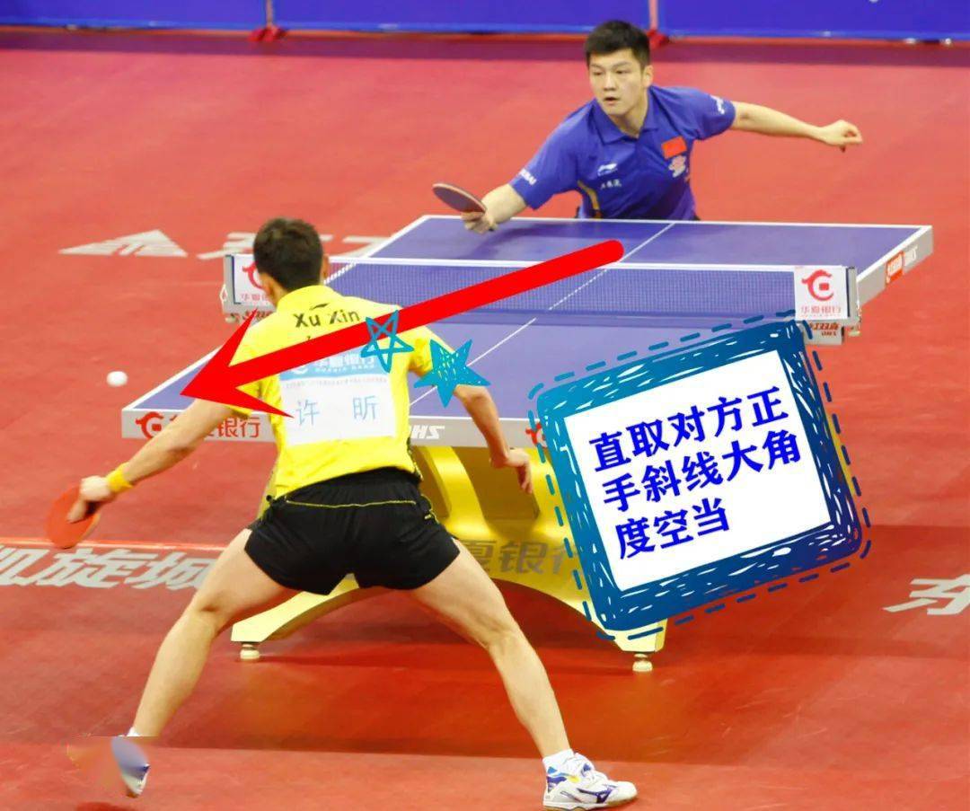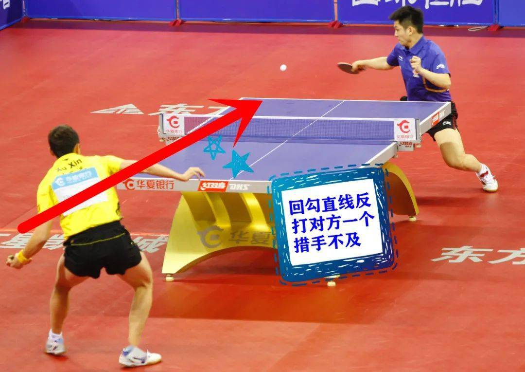 在這個(gè)回合中,樊振東發(fā)球后面對(duì)許昕的擺短,上步運(yùn)用了一板霸道的反手?jǐn)Q沖,壓制到許昕的正手大角度外斜線。