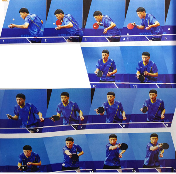 在本組乒乓球技術(shù)圖解中,李田光結(jié)合自己的技術(shù)特長(zhǎng)選擇了直接倒板用生膠加力推擋。這板球的重點(diǎn)是抓佳來(lái)球的上升期,主動(dòng)迎前發(fā)力,打?qū)Ψ竭€原不及。如圖,我們可以看到李田光在擊球前有充分的蓄勢(shì)過(guò)程,從后向前的強(qiáng)勢(shì)感覺(jué)非常明顯,且擊球后手臂基本伸直,說(shuō)明他的爆發(fā)力釋放得非常集中,加之生膠擊球下扎低沉的特性,完全可以制造足夠的殺傷。如果對(duì)方對(duì)此套路有聽(tīng)戒備后,除了發(fā)球變化之外,使用者還可以在第二板進(jìn)攻時(shí)推出不同的線(xiàn)路變化,或者在擊球時(shí)加入橫向發(fā)力,利用生膠擠出非常規(guī)的旋轉(zhuǎn),用“一快一慢”結(jié)合“一快更快”,讓?xiě)?zhàn)術(shù)更加豐富。