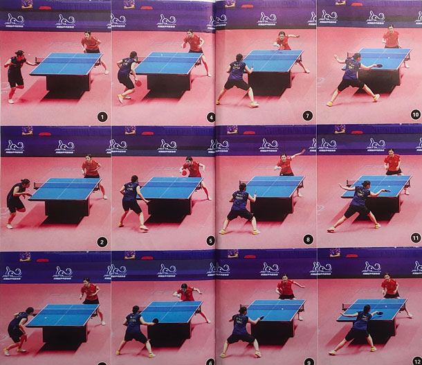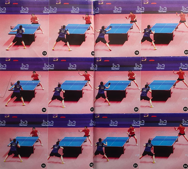 圖21-22中,陳夢(mèng)壓低球板,從后下方向前迎球摩擦球的中后偏上部。為了化解長(zhǎng)膠來(lái)球軟、下沉和不易借力的特點(diǎn),她在觸球瞬間使用手腕適當(dāng)?shù)赝夥{(diào)整板形,增加對(duì)球的接觸面,通過(guò)撞擊釋放出更多力量,給球前進(jìn)的動(dòng)力。這些細(xì)微的技巧,充分展現(xiàn)了她在