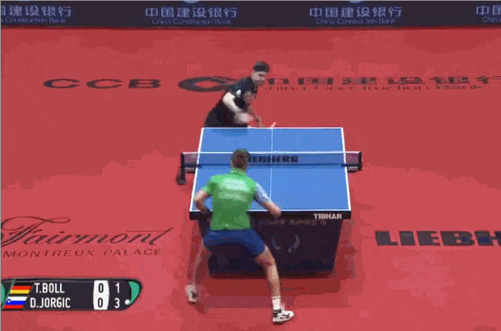 在高點(diǎn)期擊球,保證充分摩擦的前提下,用身體重心把球頂出去,比拉加轉(zhuǎn)弧圈球要有更多的向前發(fā)力。