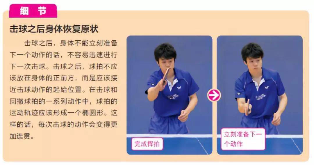 擊球時身體不能傾斜,特別是雙肩應(yīng)該保持水平。擊球之后球拍應(yīng)該停在面部前方,如果擺臂的幅度過大的話,要花很長時間準(zhǔn)備下一次擊球的動作。