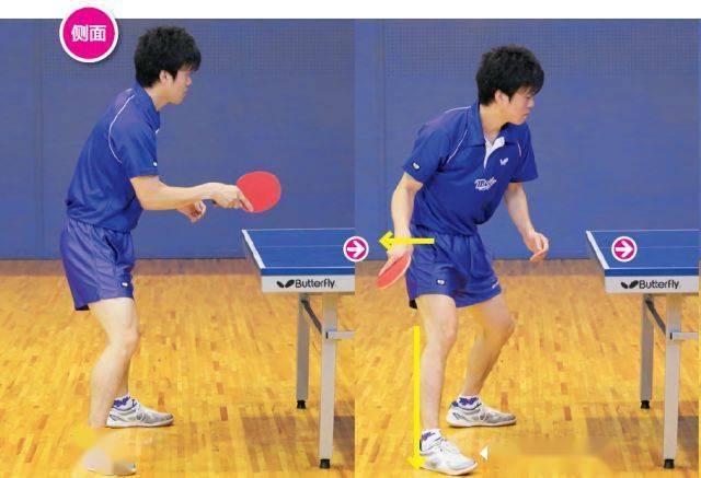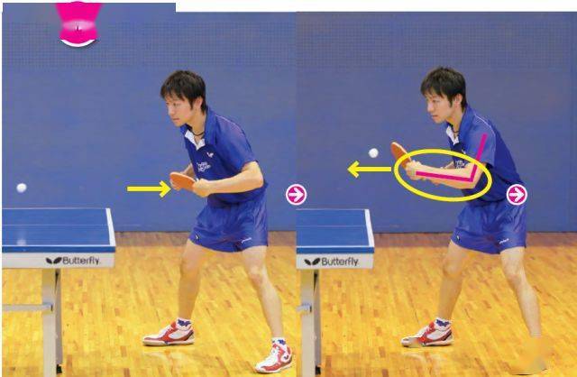 從側(cè)面的照片可以看到,擊球時幾乎不使用手腕的動作,而是揮動小臂。球拍正直向前揮動,擊打乒乓球的正后方。