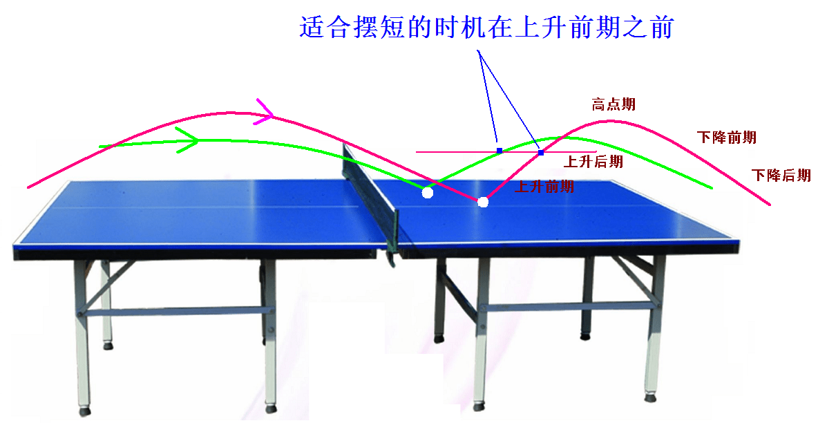 真正的擺短是在乒乓球從己方球臺彈起的上升前期球拍擊球,這樣擺出的球剛剛過網(wǎng),乒乓球前進力很小,第二跳也不出臺。對手很難找到上手進攻的機會。愛好者可以拿一個乒乓球在球臺上試一試,先等乒乓球上升前期擺短幾個球,再等乒乓球下降期擺短幾個球?qū)Ρ纫幌隆D銜l(fā)現(xiàn)乒乓球上升前期擺短的球真的比下降期擺短的球更短、更不往前走。是不是很神奇?