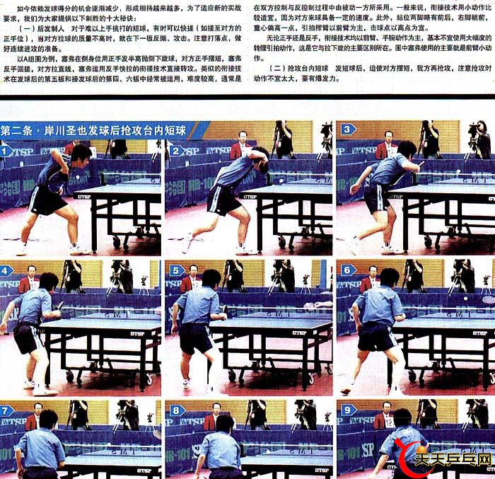 (一)后發(fā)制人 對于難以上手挑打的短球,有時可以快搓(如搓至對方的正手位),當(dāng)對方拉球的質(zhì)量不高時,就在下一板反撕、攻擊。注意打落點,做好連續(xù)進(jìn)攻的準(zhǔn)備。 以A組圖為例,塞弗在側(cè)身位用正手發(fā)半高拋側(cè)下旋球,對方正手?jǐn)[短,塞弗反手回搓,對方拉直線,塞弗運用反手快拉的銜接技術(shù)直接轉(zhuǎn)攻。類似的銜接技術(shù)在發(fā)球后的第五板和接發(fā)球后的第四、六板中經(jīng)常被運用,難度較高,通常是在雙方控制與反控制過程中由被動一方所采用。一般來說,銜接技術(shù)用小動作比較適宜,因為對方來球具備一定的速度。此外,站位兩腳略有前后,右腳稍前,重心偏高一點,引拍揮臂以前臂為主,擊球點以高點為宜。 無論正手還是反手,銜接技術(shù)均以前臂、手腕動作為主,基本不宜使用大幅度的轉(zhuǎn)腰引拍動作,這是它與拉下旋的主要區(qū)別所在。圖中塞弗使用的主要就是前臂小動作。
