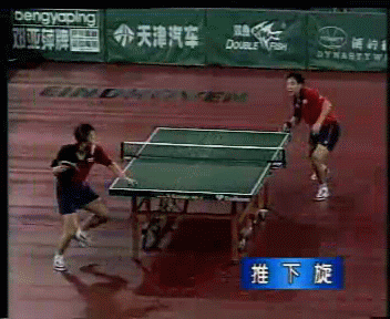 在推下旋時,球拍引至身前,拍面稍后仰,