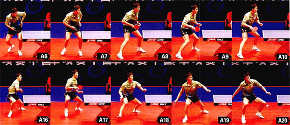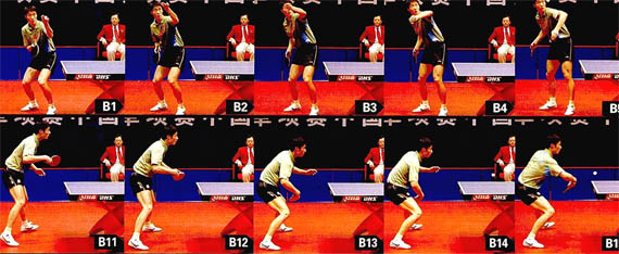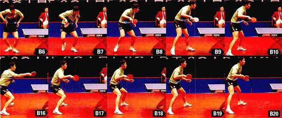 組圖A中,王勵勤發(fā)下旋短球(圖6,通過發(fā)球的第一落點,可以判斷發(fā)球的長短)。發(fā)球時,王勵勤用肩部遮擋(圖2-3),這樣既不違反規(guī)則,還起到了迷惑對方的作用。王勵勤發(fā)球后迅速調(diào)整站位,他的左腳更加靠前(圖8-9),正手進(jìn)攻的意圖十分明顯。對方回球后,王勵勤腳下提前移動,他右腳蹬地,先墊一小步(圖10),然后將身體重心放于右腳(圖11),發(fā)力蹬地,左腳大幅度跨向左前方(圖12),身體重心壓得很低,同時轉(zhuǎn)腰引拍(圖13)。擊球時,王勵勤將身體重心壓向左腿,上半身向前壓(圖14),這樣不但可以保證身體的穩(wěn)定性,擊球后還可以迅速還原。王勵勤觸球瞬間,前臂收縮幅度很大,本臂同時向前送出,這是為了壓住拉球的弧線,并充分釋放身體的爆發(fā)力(圖15)。擊球后,王勵勤左腳蹬地,迅速還原,準(zhǔn)備撲正手連續(xù)進(jìn)攻(圖16-20)。www.qikan.com.cnfSKTNcEnbdFj3meJ