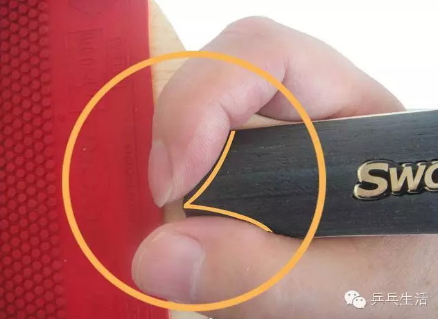 其次整個(gè)擊球用力全部是通過(guò)中指④傳遞到球拍的擊球位置,因此使中指④的位置適當(dāng)靠近球拍的觸球點(diǎn)有利于提高擊球用力傳遞的效率。