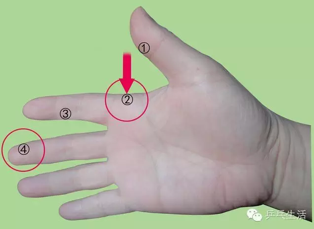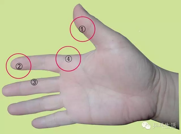 直握拍需要拇指①、食指③、和中指④三個(gè)著力點(diǎn)協(xié)調(diào)用力,拍柄背面貼靠虎口的食指根部②——是上述手指用力的支點(diǎn)。①、③、④三個(gè)手指圍繞著支點(diǎn)②操控球拍的拍形角度和調(diào)節(jié)擊球的杠、旋用力,因此支點(diǎn)②的穩(wěn)定性非常重要。正確的握法是將球拍背面的拍柄靠在食指根部關(guān)節(jié)②——較硬的穩(wěn)定部位,不可深入虎口內(nèi),將拍柄整個(gè)陷入虎口的軟組織中;