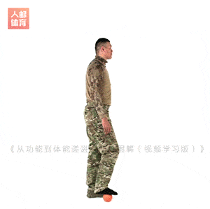 直立姿,挺胸直背,目視前方,將筋膜球置于右腳足底。移動右腳,在可承受范圍內利用盡可能多的自身重量進行滾壓,尋找明顯酸痛點,并在酸痛點著力滾動。兩側交替進行。