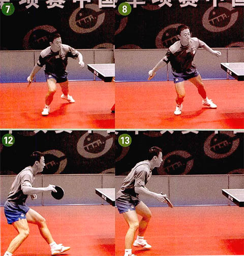 圖11-13中我們看到馬琳左腳快速回撤,右腳跟進(jìn)的還原動(dòng)作。雖然失去了反手位,但重心迅速回到身體中軸線使馬琳仍能夠保證下板擊球。www.qikan.com.cnq7lt4kIJziUi21Ms