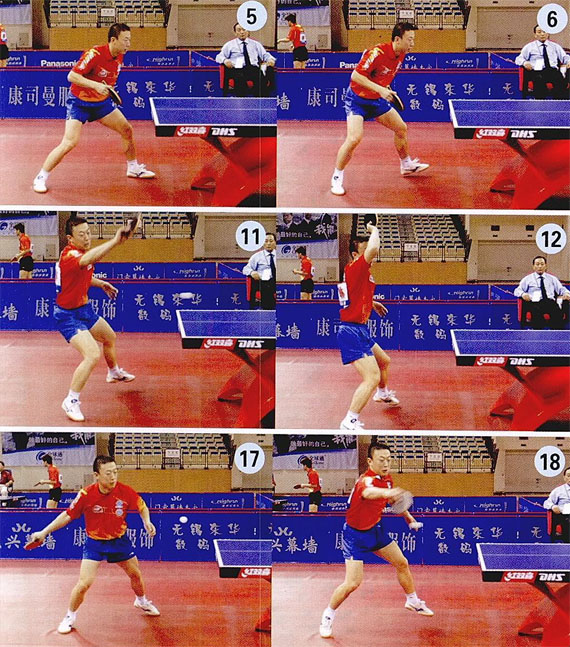 組圖中,馬琳發(fā)球時(shí)的手腕動(dòng)作很小,幾平是靠前臂發(fā)力,因此這個(gè)發(fā)球的旋轉(zhuǎn)不太強(qiáng)烈(圖1—2),此發(fā)球的第一落點(diǎn)在球臺(tái)的中間位置,可以看出這個(gè)發(fā)球的弧線較短(圖3)。馬琳發(fā)球后,迅速后撒(圖4—7),做好防守和進(jìn)攻的雙重準(zhǔn)備。對(duì)方接發(fā)球劈長(zhǎng)到馬琳正手位、馬琳蹬左腿,壓低身體重心(圖8),在身體移動(dòng)的過(guò)程中轉(zhuǎn)腰(圖9)。馬琳擊球前,他的手臂幾乎完全打開(kāi),手腕充分外展(圖10),擊球時(shí)他的身體重心向后坐,依然將手腕向后外展(圖11),拼命向上發(fā)力摩擦(圖12),拉了一板直線。馬琳向后壓重心并向上發(fā)力的目的是為了將球的弧線控制得更短,這板拉球的旋轉(zhuǎn)很強(qiáng)。擊球后,馬琳迅速還原(圖13—14),準(zhǔn)備連續(xù)進(jìn)攻。對(duì)方回球后馬琳將右腿稍稍向后,增大身體和球臺(tái)的距離(圖15),這樣可以增大擊球的空間。馬琳的第二板拉球頗具威脅,他左腿蹬地,使身體騰空,通過(guò)在空中的轉(zhuǎn)體,完全運(yùn)用了身體的力量(圖16—19)。馬琳拉這板球的時(shí)候,他先將手腕內(nèi)扣,擊球的右側(cè)部(圖18),然后快速收縮前臂,向身體左側(cè)發(fā)力(圖19)。擊球瞬間,他增大手腕內(nèi)扣的幅度,使回球帶有強(qiáng)烈的側(cè)旋。擊球后,馬琳再次還原,準(zhǔn)備連續(xù)相持。(圖20—22)