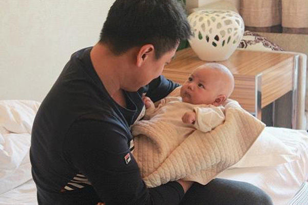 王皓來月子會所接妻兒回家,