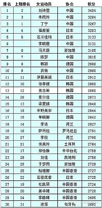女子方面,劉詩雯憑借在女子世界杯上成功奪魁,積分上超過丁寧,重返世界排名第一,獲得世界杯女單銅牌的德國選手索爾加,排名上升12位至14名,創(chuàng)職業(yè)生涯新高,同時她也成為了本期女子前30名中漲幅最大的選手。此外,因長期缺席國際乒聯(lián)比賽一度無緣積分排行榜的李曉霞,重歸世界排名的榜單。