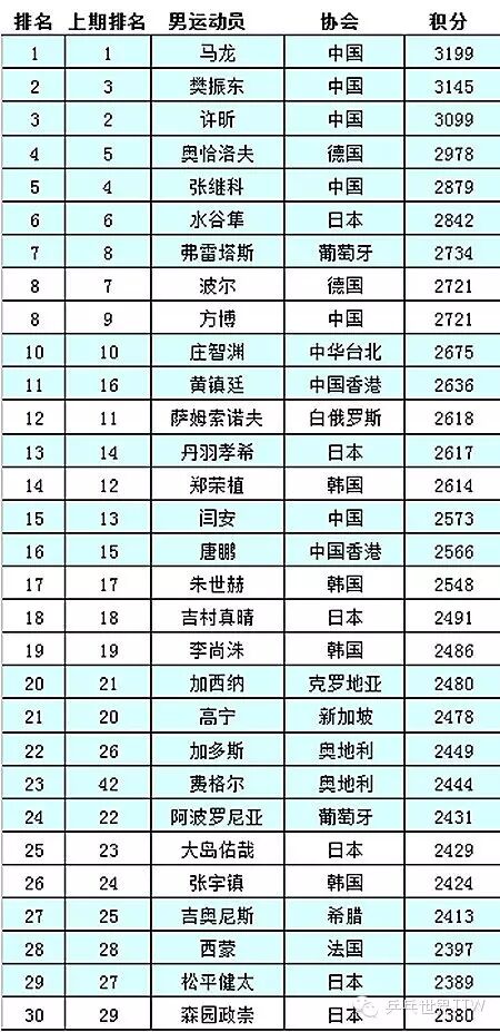 男子方面,中國四大主力在世界排名上的壟斷被打破,張繼科因波蘭公開賽中發(fā)揮欠佳,排名跌至第5名,排在第4位的是德國選手奧恰洛夫。而爆冷擊敗了張繼科的奧地利選手費格爾,世界排名飆升19位至23名,成為本期男子前30名中漲幅最大的選手。