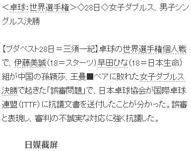 日本乒協(xié)向ITTF遞交了抗議信,認(rèn)為這是一個(gè)誤判,這是對(duì)裁判不誠(chéng)實(shí)的強(qiáng)烈抗議。