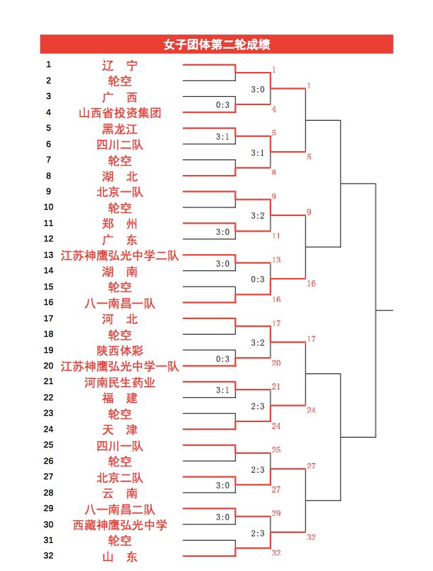 其他方面,武楊領(lǐng)銜的山西省投資集團(tuán)3比0力克廣西隊(duì),擁有錢天一、石洵瑤和張薔三名新銳的江蘇神鷹弘光中學(xué)一隊(duì)3比0擊敗了陜西體彩,北京二隊(duì)淘汰了云南隊(duì),廣東隊(duì)不敵鄭州,孫銘陽率八一南昌二隊(duì)直落三盤戰(zhàn)勝了西藏神鷹弘光中學(xué),江蘇神鷹弘光中學(xué)二隊(duì)3比0勝湖南隊(duì),福建隊(duì)則1比3不敵河南民生藥業(yè),她們拿到的唯一一分是由李仁思佳3比2戰(zhàn)勝了袁雪嬌而獲得。