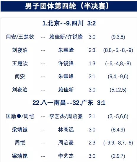 八一南昌的決賽對(duì)手是北京隊(duì)。此前北京隊(duì)晉級(jí)道路基本上沒(méi)有遇到太大波折,均以3比0過(guò)關(guān),但是本場(chǎng)比賽,他們?cè)庥龅搅怂拇ㄒ魂?duì)的強(qiáng)勢(shì)挑戰(zhàn)。首盤(pán)比賽,北京隊(duì)贏得較為輕松,王楚欽/閆安直落三局擊敗了賴佳新/許銳鋒,取得開(kāi)門(mén)紅,但是隨后的第二盤(pán),此前1/4決賽戰(zhàn)勝了于子洋的小將劉夜泊沒(méi)有再創(chuàng)造奇跡,他在2比0領(lǐng)先的情況下被朱霖峰連扳三局逆轉(zhuǎn)勝出,雙方打成1比1平。