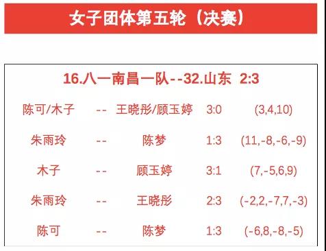 另外一場半決賽由黑龍江隊對陣八一南昌一隊,前面的1/4決賽,黑龍江隊3比1戰(zhàn)勝了衛(wèi)冕冠軍遼寧隊,八一南昌一隊直落三盤擊敗了北京一隊。首盤比賽,陳可/木子直落三局戰(zhàn)勝了車曉曦/張繽月,為八一南昌一隊先拔頭籌,緊接著的雙方頭號主力交鋒,朱雨玲3比0戰(zhàn)勝了王曼昱,為隊伍擴大領先優(yōu)勢,隨后黑龍江隊展開反撲,車曉曦和王曼昱分別以3比0戰(zhàn)勝了木子和陳可,雙方大比分戰(zhàn)成2比2平。關鍵的第五盤,朱雨玲再度上場以3比0擊敗張繽月,幫助八一南昌一隊鎖定勝局。