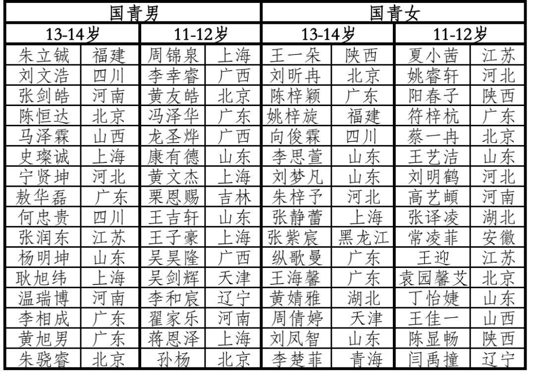 昨天,中國(guó)乒協(xié)國(guó)家乒乓球青少年集訓(xùn)隊(duì)和少兒集訓(xùn)隊(duì)(第一期)第二階段選拔賽最后兩個(gè)組別:女子7-8歲組、男子9-10歲組的爭(zhēng)奪分別在福建廈門賽區(qū)和湖北黃石賽區(qū)順利完賽,這樣, 各組別入圍第一期國(guó)家青少集訓(xùn)隊(duì)的前16名全部產(chǎn)生——