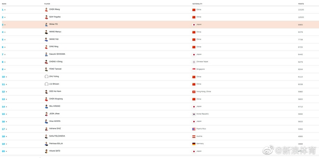 男單前五:樊振東、馬龍、許昕 、雨果·卡爾德拉諾 、張本智和。女單前五:陳夢(mèng)、孫穎莎、伊藤美誠(chéng)、王曼昱 、王藝迪。