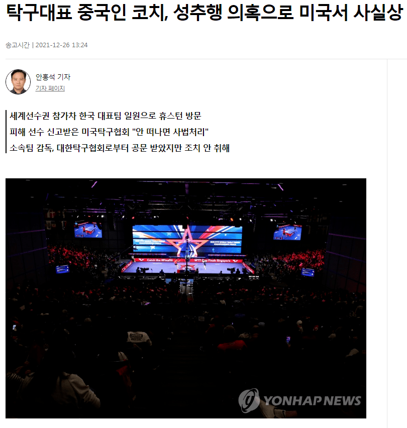 兩天,韓媒報(bào)道了韓乒一教練因涉嫌對(duì)美乒乓隊(duì)員張安進(jìn)行性騷擾,在入境美參加世錦賽時(shí),遭到驅(qū)逐,韓乒專務(wù)金澤洙要求嚴(yán)查。
