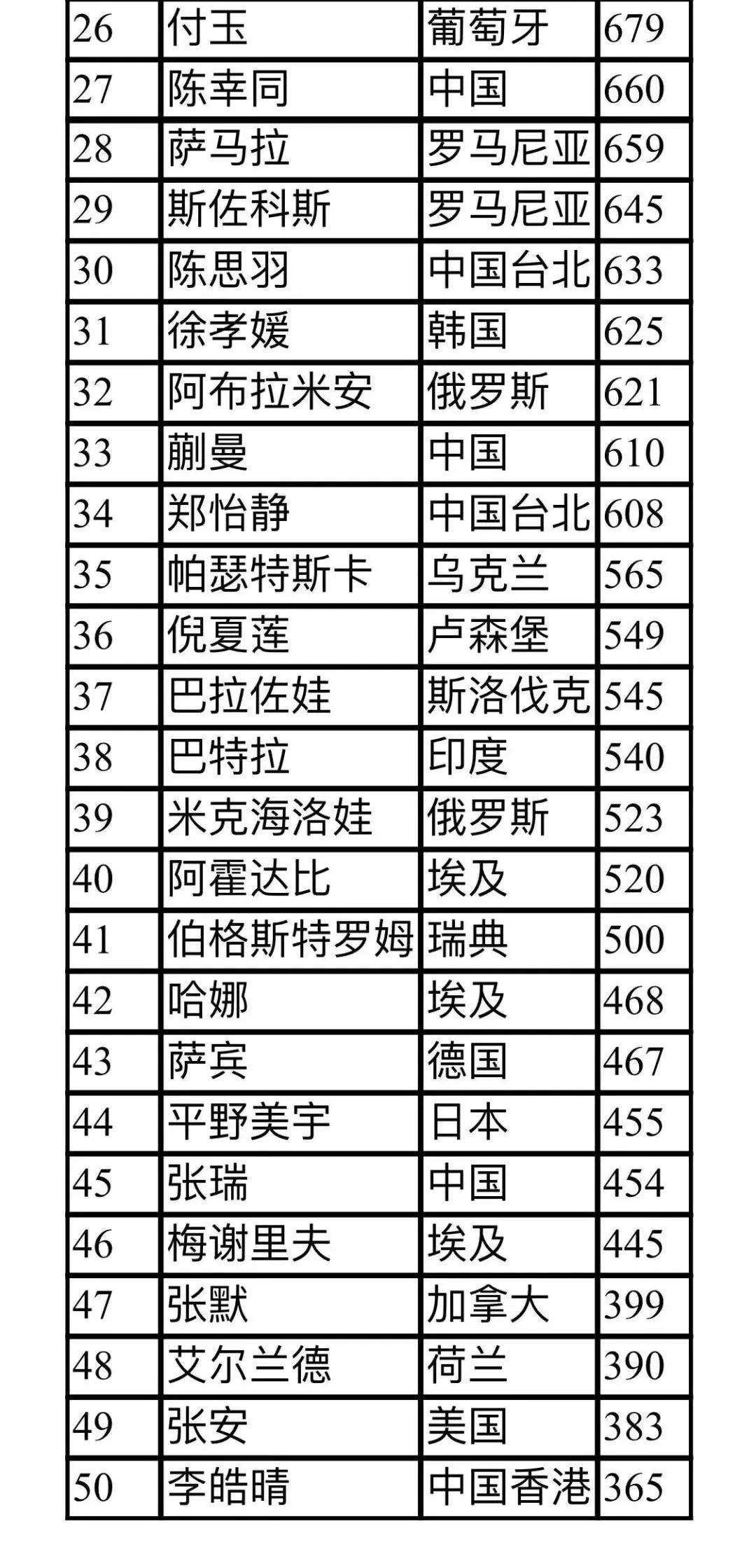 女單排名前50位