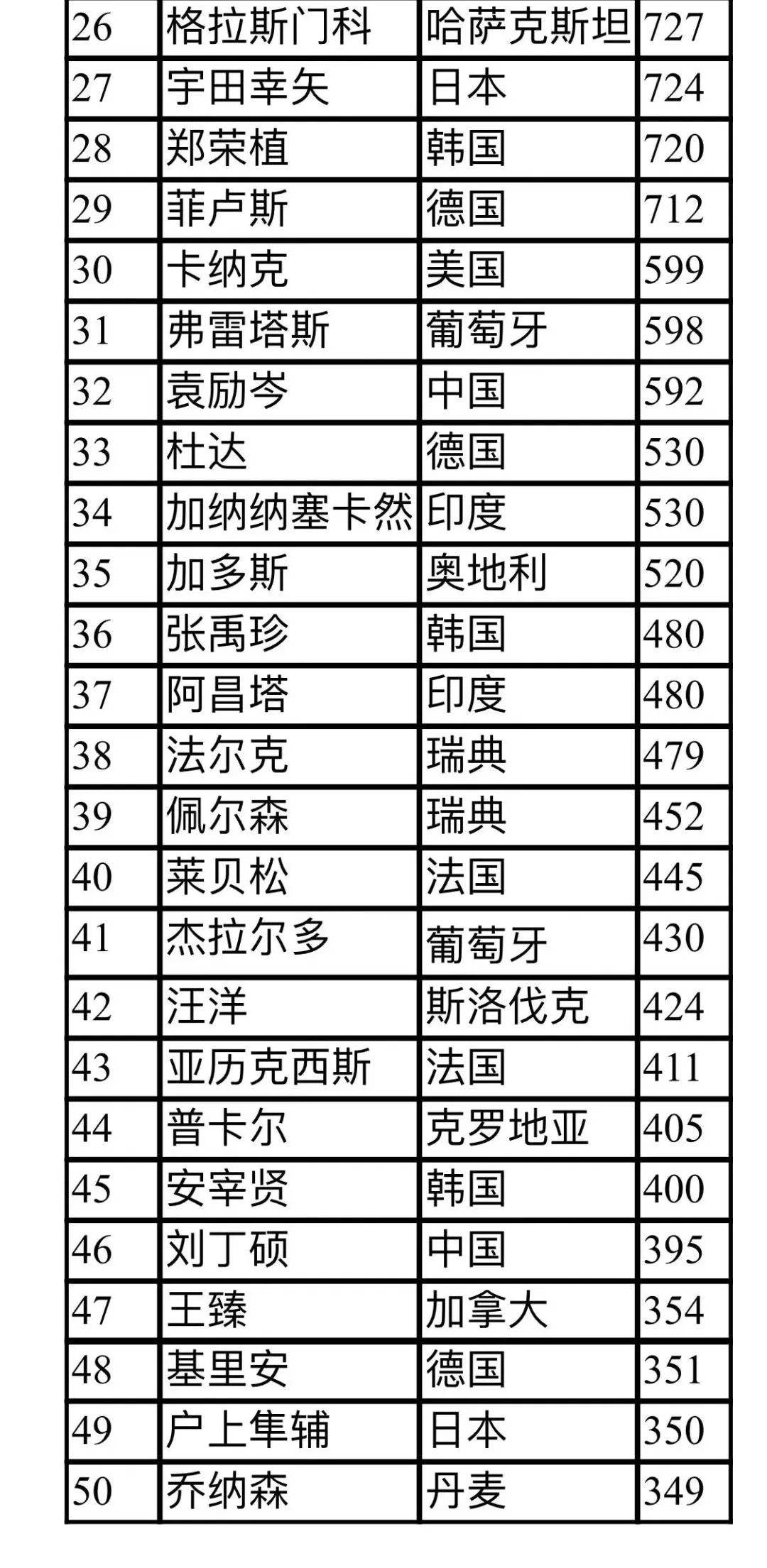 男單排名前50位