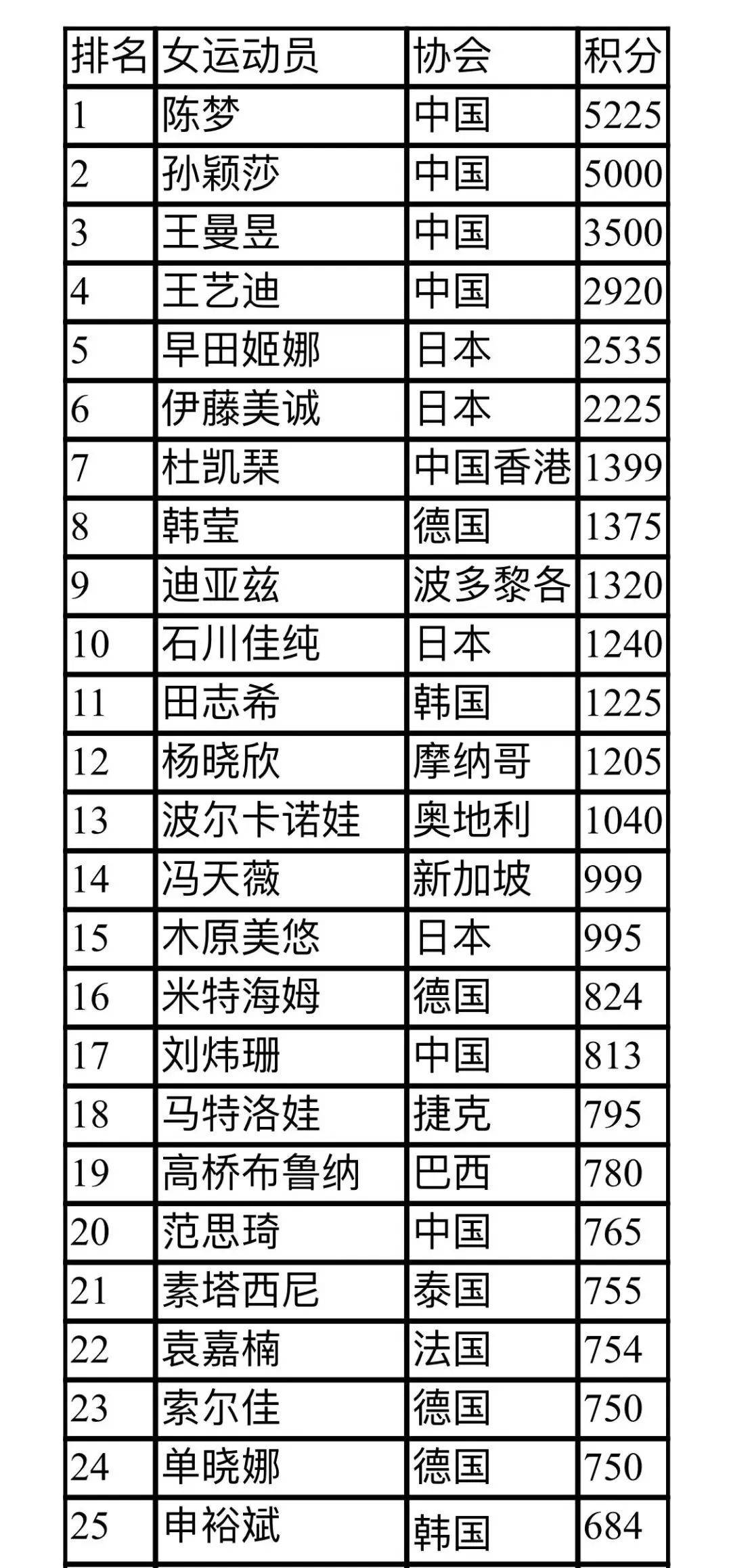 女子方面,國乒三朵金花陳夢、孫穎莎、王曼昱繼續(xù)穩(wěn)坐三甲。王藝迪上升一位,助國乒包攬排名前4。