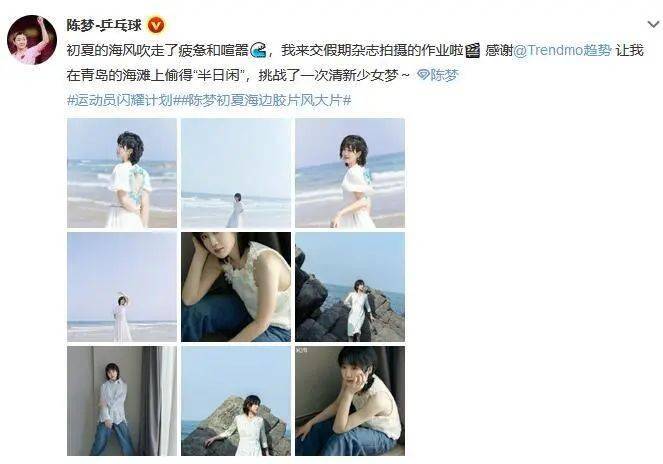 也難怪,陳夢(mèng)自己發(fā)文都說(shuō)了,她在海灘上偷得“半日閑”,挑戰(zhàn)了一次清新少女夢(mèng)。真的很清新,海天相接處,就像小仙女下凡一樣。