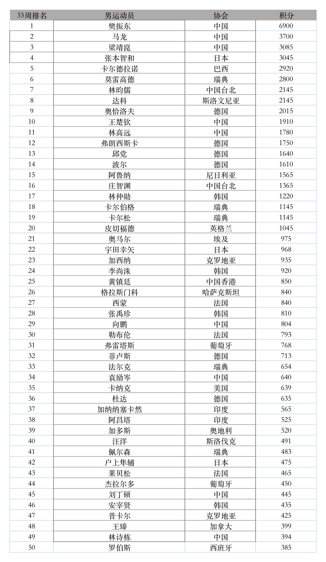 其他中國隊球員方面,林高遠排名第11,向鵬排名第29,袁勵岑排名第34,劉丁碩排名第45,林詩棟排名第49。