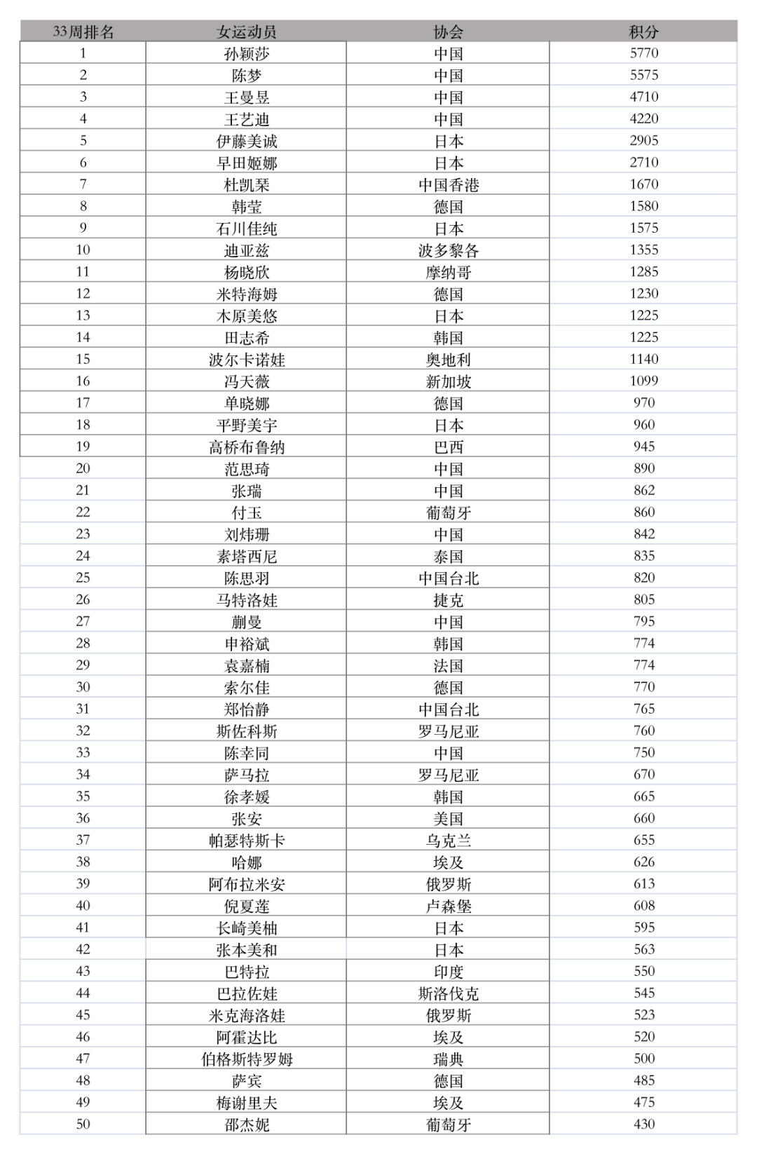 女單前十同樣無變動,中國隊球員孫穎莎、陳夢、王曼昱和王藝迪位列前四。