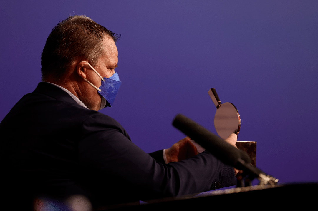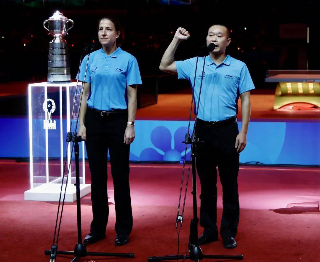 9月29日,成都團體世乒賽開幕式在高新體育中心舉行。開幕式上,國際乒聯(lián)執(zhí)?副主席、WTT世界乒聯(lián)董事兼理事會主席、中國乒協(xié)主席、2022年第56屆世界乒乓球團體錦標賽(決賽)執(zhí)行主任劉國梁,國際乒聯(lián)執(zhí)行副主席、WTT世界乒聯(lián)董事、亞乒聯(lián)盟主席、卡塔爾乒協(xié)主席卡里爾·阿爾·默罕納迪將男團獎杯斯韋思林杯和女團獎杯考比倫杯置于場地中央。