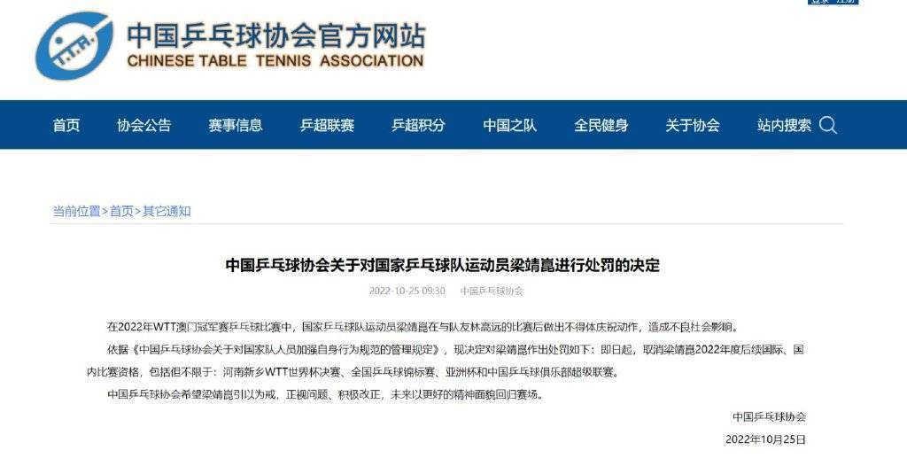中國(guó)乒乓球協(xié)會(huì)希望梁靖崑引以為戒,正視問題,積極改正,未來以更好的精神面貌回歸賽場(chǎng)。