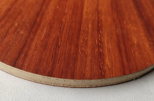 仔細(xì)觀察紅檀木的花紋,有比較長的氣孔,紅檀本不是常規(guī)的面材用料,之前了解不多,細(xì)細(xì)觀察紅檀的木紋竟然有點(diǎn)像染過色的林巴木。雖然在官方介紹里紅檀木是四款木材中最軟的一款,但其畢竟是一款硬木面材。紅檀芳碳王底板的板面是150×162的常規(guī)板面尺寸,底板厚度大約為6毫米,直板裸板重量為85克左右。敲擊底板的聲音是非常清脆的“咚咚”的聲音,共振明顯,感覺整體并不是太硬,也算是一塊較為明顯的外硬內(nèi)軟結(jié)構(gòu)的底板。