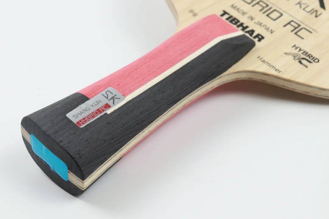 在結(jié)構(gòu)方面,SK Hybrid AC只是將SK Hybrid ZC的纖維層從超級纖維換成了芳碳,面材與力材依舊是林巴,芯材也依舊是阿尤斯。國行版本標配Big Hammer大板面,尺寸為161*158mm,是如今市面上進攻型球板中最大的板面之一。拍柄尾部的“TIBHAR”標鍍上了一層藍色,有一種若影若現(xiàn)的高級感。