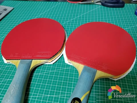 對(duì)比評(píng)測(cè)的是兩塊特制506底板,一個(gè)數(shù)字,一個(gè)字母;一個(gè)正手配2.1mm橙海綿狂飆,一個(gè)正手配2.2mm橙海綿狂飆;兩個(gè)板子反手均為2.0mm海綿性能類(lèi)似的外衣,一個(gè)為驕猛歐米茄5pro版,另一個(gè)為挺秀MXP。
