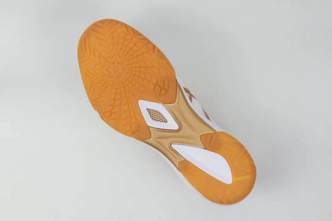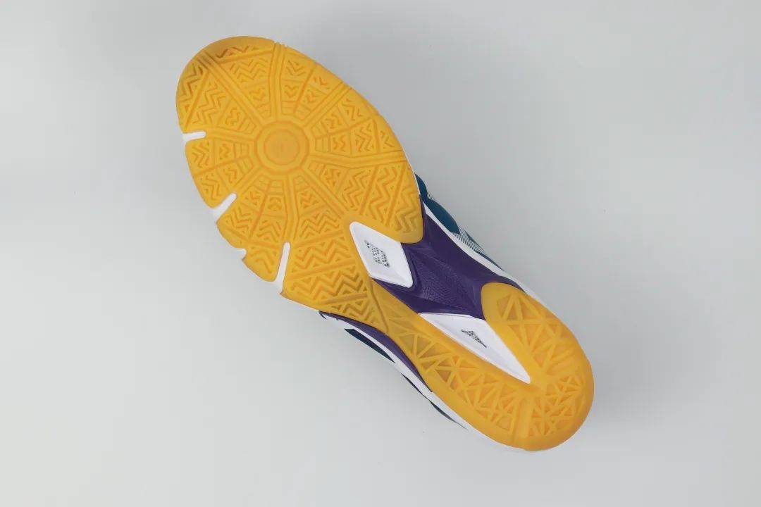當然,作為一款乒乓球鞋,鞋底才能算上是球鞋的“靈魂”。Bladelyte 4在鞋底方面雖然依舊采用分離式大底設計,但是在紋路走勢方面卻有不小的變化。在前腳掌部位的紋路上, Bladelyte 4將拇指球安置在了腳掌中心,并向四周發(fā)散人字型防滑紋,每條防滑紋的角度都不一樣,能夠有效強化前腳掌在蹬地時各個部位的抓地效果,需要留意的是防滑紋的紋路并不算深,在單點蹬地、碎步調(diào)整上依舊保持著較為靈活的腳感。而在后腳掌紋路的設計中,防滑紋的走勢有些鞋面式的網(wǎng)狀風格,但是紋路要比前腳掌更為深邃,止滑效果更為顯著。