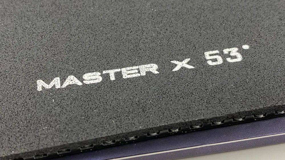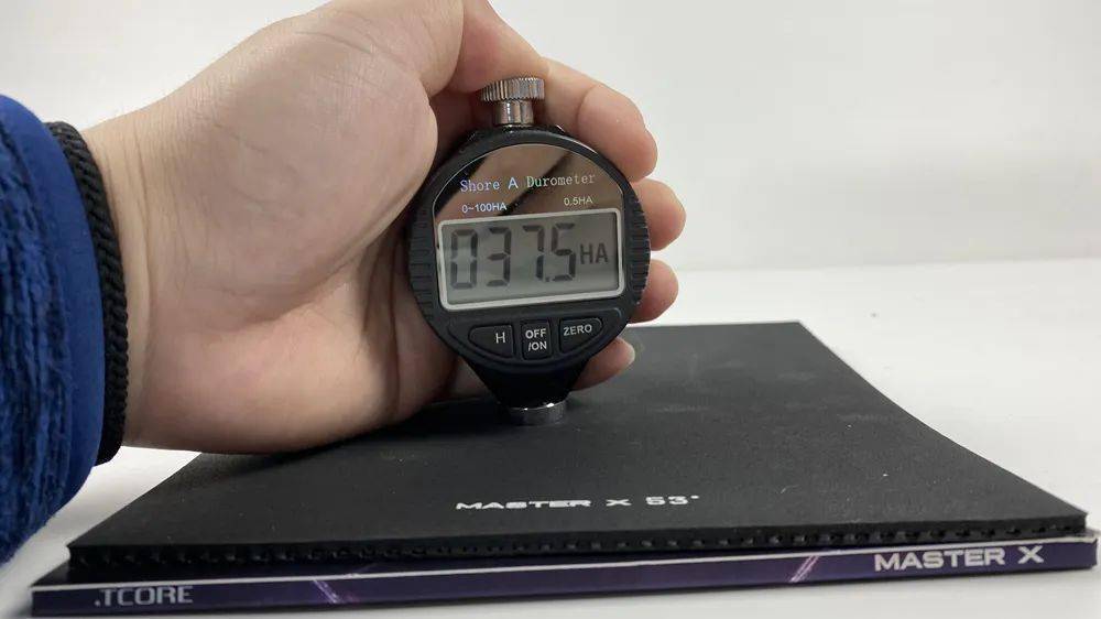 細(xì)看膠皮結(jié)構(gòu),Master X的面膠不厚,倒是齒粒有些偏大且偏密,膠皮的裸重為68.45g,官宣德系硬度為53度,實(shí)測整體硬度(邵氏A標(biāo)準(zhǔn))約為37.5度(差不多相當(dāng)于40度海綿狂飚3的整體硬度),整體符合正手膠皮的定位。