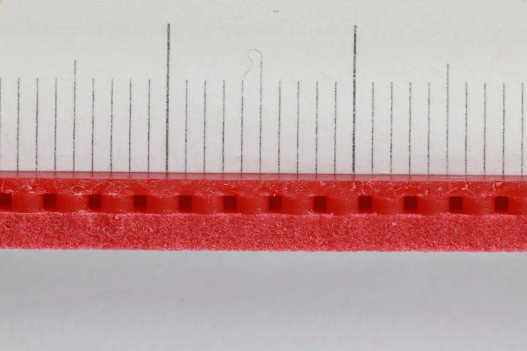 面膠方面,其實(shí)之前天弓5面膠出眾的磨砂質(zhì)感實(shí)現(xiàn)的澀性效果已經(jīng)相當(dāng)不錯(cuò),在金弓9的面膠上,紅雙喜則更進(jìn)一步:細(xì)膩潤(rùn)澤且緊繃的肉眼觀感,甚至讓人感覺這不像是一張國(guó)產(chǎn)的膠皮,底皮稍薄,且搭配特殊的塔型齒粒,面膠在受力之后的下陷感很充沛,完美實(shí)現(xiàn)停球效果。除此之外,紅雙喜在金弓9上還應(yīng)用了第二代高彈粒子滲透技術(shù)(H-EPO2),雙重激活膠皮和海綿的彈性。