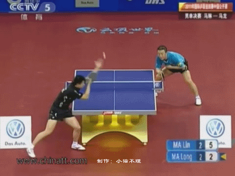 仔細看上下兩圖,是不是有種異曲同工的感覺,無論是結束時的位置、腳步動作、對手位置都很相像!再比較兩人的落點,幾乎是在同一個位置:壓在了球桌的白線部份,幾乎看不到球,這個位置離對手還有一兩個身位,無論如何都夠不到了.(國梁直接沒動,小馬試圖撲救已經(jīng)來不及了)