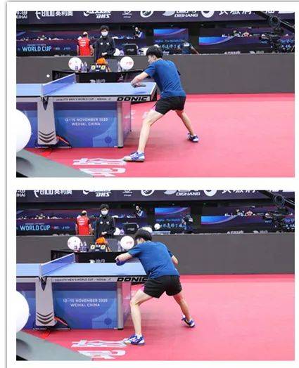 如上圖,林昀儒接發(fā)球的進攻意識很強,他側(cè)身到正手位準備使用反手擰拉處理接發(fā)球。移動中,他隨著來球節(jié)奏逐漸引開手腕,但當他準確判斷到來球的落點、旋轉(zhuǎn)及弧線后,發(fā)現(xiàn)并不適合使用反手擰拉,于是他及時調(diào)整還沒有完全展開的手腕,選擇了更為合理的擊球方式,這一點應變的速度非常快。在完成精準找位的同時,林昀儒調(diào)整板形改擰為劈。 雖然劈長的威脅小于反手擰拉,但林昀儒通過瞬間發(fā)力化解了對方發(fā)球的旋轉(zhuǎn),并利用劈長落點向?qū)κ质海诓皇俣鹊那闆r下盡量給對方增加銜接的難度。