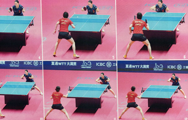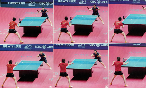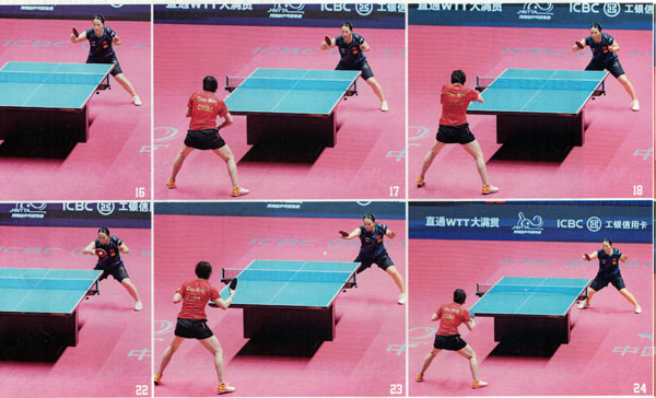 可卓佳防回的球在落到陳夢球臺后的第二跳弧線要比正常的球更低、更短,且下墜速度較快。陳夢在應(yīng)對這板長膠貼防時非常沉穩(wěn)。如圖15-17,她站住位置跟佳來球,使用手臂隨球引手,保證擊球動作銷能對準(zhǔn)來球。到圖17-20中,陳夢在向前上方頂拉制造弧線的同時,