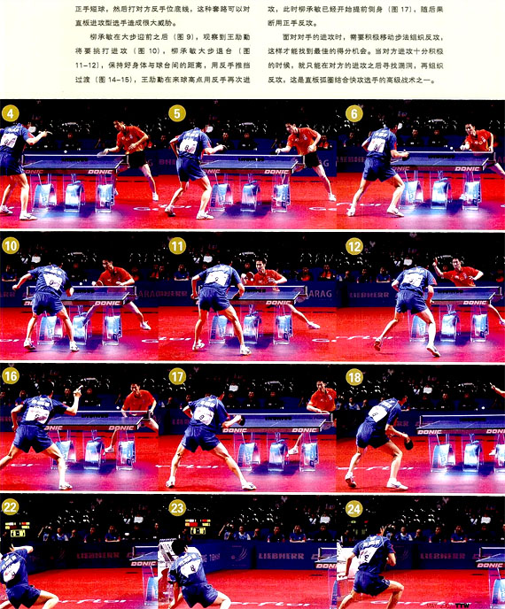 在此我們介紹世界名將柳承敏和王皓的實(shí)戰(zhàn)戰(zhàn)例。通過組圖,我們來分析韓國(guó)選手與中國(guó)選手直板進(jìn)攻技術(shù)的不同風(fēng)格。