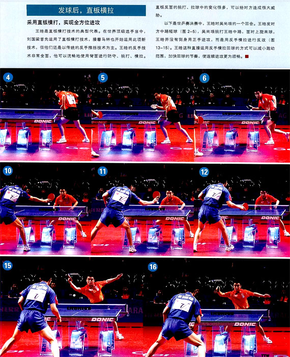 不來梅世乒賽的團(tuán)體半決賽,韓國(guó)對(duì)陣中國(guó)香港。同為直板選手的柳承敏與李靜成為場(chǎng)上的焦點(diǎn)。組圖中,李靜發(fā)對(duì)方反手位短球,柳承敏接發(fā)球時(shí)似乎準(zhǔn)備擺短(圖4),但是他在擊球的瞬間劈長(zhǎng)至對(duì)方的正手位底線(圖5),迫使李靜被動(dòng)地拉一板高吊。圖6—8中可以看到,柳承敏提前退半步至中臺(tái),準(zhǔn)備反拉(圖10—12)。這種讓對(duì)方先起板、再反攻,后發(fā)制人的戰(zhàn)術(shù)十分常見。但是,此戰(zhàn)術(shù)稍有閃失便會(huì)導(dǎo)致失敗。當(dāng)對(duì)方先起板后,如果自己的判斷失誤,極有可能被對(duì)方直接進(jìn)攻得分。圖中柳承敏的劈長(zhǎng)速度快、旋轉(zhuǎn)強(qiáng),迫使李靜無法高質(zhì)量進(jìn)攻,此外柳承敏接發(fā)球時(shí)的迷惑動(dòng)作也給李靜制造了很大困難。如果柳承敏的接發(fā)球出現(xiàn)漏洞,就會(huì)承擔(dān)極高的風(fēng)險(xiǎn)。www.qikan.com.cnBTakMEgUK4Ig1Tua