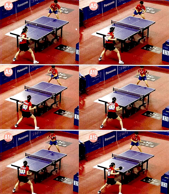 組圖A中,白楊發(fā)側(cè)下旋半出臺球到郭躍的中路偏反手位置(圖2),郭躍跨一步到中路,在臺內(nèi)用反手快拉斜線(圖3)。白楊突然發(fā)力彈擊到郭躍的反手位大角,此時(shí)我們可以看到擅長正手技術(shù)的郭躍準(zhǔn)備側(cè)身還擊(圖4)。由于白楊回球的線路刁鉆,郭躍只能繼續(xù)用反手回球 (圖5—6)。郭躍回球后迅速后撤,這樣可以增大擊球空間,有利于發(fā)力回球,而白楊繼續(xù)壓住郭躍的反手位;遏制對方側(cè)身進(jìn)攻(圖8)。此時(shí)郭躍增大轉(zhuǎn)腰的幅度,加力回球到白楊反手位 (圖9—10),白楊穩(wěn)健地用反手飄一板斜線(圖11一13)。“飄’這項(xiàng)技術(shù)通常是顆粒膠皮打法的特長,一般在來球的最高點(diǎn)擊球,擊球瞬間帶有摩擦,借來球的力量回球。飄過去的球速度較慢,飄忽不定,當(dāng)球落臺時(shí)沒有強(qiáng)烈地向前沖擊的力量,這種回球可以很好地改變擊球的節(jié)奏。www.qikan.com.cnGQ8yD6jSAEgoccb7 郭躍盯住來球,準(zhǔn)備連續(xù)發(fā)力,但是來球速度突然減慢,而且不向前走,郭躍只能將手臂盡量伸直,靠手臂和手腕來調(diào)節(jié)回球的弧線(圖14)。郭躍這板回球直逼白楊反手位太角,隨后郭躍果斷側(cè)身,準(zhǔn)備側(cè)身用正手給于致命一擊(圖15)。白楊面對頗具威脅的來球十分冷靜,她迅速跨右腿,調(diào)整好站位,借來球的力量突然回直線到郭躍的正手位空檔。白楊的回球速度快,落點(diǎn)刁鉆,贏得了漂亮的一分(圖15—18)。www.qikan.com.cnGQ8yD6jSAEgoccb7